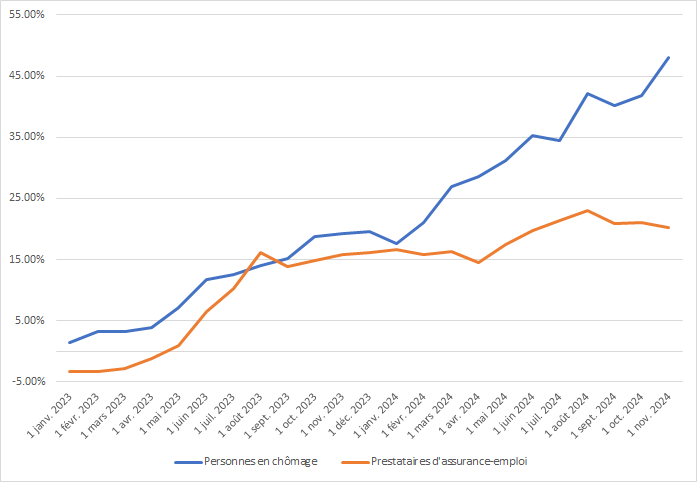 Graphique 1 : Personnes sans emploi par rapport aux prestataires d’assurance-emploi, variation en pourcentage depuis décembre 2022